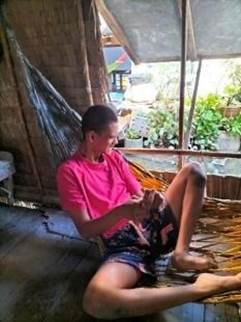 หลังจากทีมศปจ.สมุทรปราการได้แนะนำตัวกับคุณยายประนอมแล้ว ก็ได้นั่งพูดคุยไต่ถามสารทุกข์สุกดิบในการดำเนินชีวิตของครอบครัว คุณยายประนอม เล่าให้ฟังด้วยสีหน้ายิ้มแย้มว่า “ สามีเสียชีวิตไปนับ 10 กว่าปี แล้ว มีลูกด้วยกัน 4 คน เสียไปแล้ว 1 คน แยกไปมีครอบครัวหมดแล้ว ตอนนี้บ้านที่อาศัยอยู่นี้อยู่กับลูกสาว และหลานๆ ซึ่งมีหลานแฝดที่พิการ 1 คน เพราะตอนลูกสาวท้องไม่รู้ว่ามีลูกแฝด พอคลอดลูกแฝดคนโตแล้ว ถึงได้รู้ว่ามีแฝดคนน้องอีกคน แต่ใช้เวลานานทำให้เด็กขาดอ้อกซิเจน จึงเกิดมามีความพิการแต่กำเนิด แต่ช่วยเหลือตนเองและสื่อสารได้ ส่วนคนแฝดพี่แข็งแรงดีทำงานบริษัทส่วนตัวเองก็มีโรคประจำตัวคือ เบาหวานและความดัน รักษาตัวอย่างต่อเนื่องที่ รพ.สต แหลมฟ้าผ่า แข็งแรงดี ชีวิตแต่ละวันมีความสุขดี ไม่เครียดถึงแม้จะมีหนี้สินจากกองทุนหมู่บ้าน และยังโชคดีที่มีหมอขวด ผู้ใหญ่บ้าน และอสม.ที่ดีแวะเวียนมาให้การช่วยเหลือตลอด มาซ่อมแซมบ้านและหลังคาบ้านให้เป็นใบจากใหม่ ปีนี้ครอบครัวได้รับเงินหมื่นจากรัฐจำนวน 3 คน ทำให้นำไปชำระหนี้สินและใช้จ่ายในครอบครัวได้ ก็มีความสุขตามประสา ไม่คิดอะไรมาก มีชีวิตยังอยู่ก็สู้กันไป”