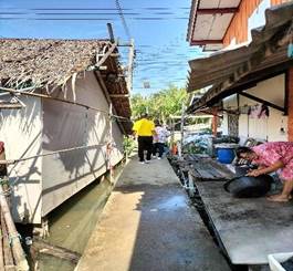 บ้านหลังแรกของการมาเยี่ยมเยียนของทีมเราที่เป็นจุดหมายปลายทางในวันนี้ เป็นบ้านเลขที่ 6 หมู่ 2 ต.นาเกลือ ของผู้มีภาวะเปราะบางในกลุ่มผู้สูงอายุนั่นคือ คุณยายประนอม สง่างาม วัย 73 ปี บริเวณจากถนนเข้าสู่ทางเดินเข้าบ้าน เป็นทางเดินปูนแคบๆเดินสวนกันลำบาก มีโอกาสตกสูงมากหากไม่หลบหลีกกันดีดี สองข้างทางก่อนถึงบ้านคุณยายประนอมมีบ้านเรือนของญาติๆตั้งอยู่เรียงรายทั้งสองฝั่งของถนนปูนแต่ทุกหลังเสาบ้านจะตั้งอยู่ในน้ำ ที่เป็นน้ำขังที่เอ่อล้นมาจากคลองสรรพสามิต โดยพี่วัฒนา อ่ำถนอม อสม.ที่ดูแลหมู่ 2 เล่าให้ฟังว่า ที่ดินที่ตั้งบ้านเรือนที่ปลูกอาศัยอยู่กันตั้งแต่ปากทางเข้ามาตำบลแหลมฟ้าผ่า จนมาถึงตำบลนาเกลือเช่าที่ราชพัสดุโดยจ่ายเป็นรายปี ราคาแตกต่างกันแล้วแต่ขนาดของบ้าน บ้านเรือนที่ปลูกจึงไม่เป็นระเบียบแล้วแต่กำลังทุนทรัพย์ของแต่ละคนแต่ในบริเวณนี้ทุกหลังเป็นเครือญาติที่ช่วยเหลือพึ่งพากันได้ ส่วนเรื่องน้ำขังใต้ถุนบ้านที่เป็นปัญหาสิ่งแวดล้อมนั้น ก็เป็นปัญหาที่แก้ไขได้ยากเพราะบ้านเรือนปลูกติดคลองจึงได้แต่บอกบ้านเรือนทุกหลังให้จัดบ้านเรือน