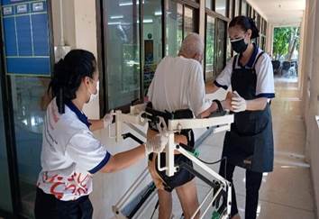 การฝึกเดิน การทำกายภาพบำบัด โดยมีนักศึกษาจากสถาบันการศึกษามาฝึกงานและช่วยใน ศพส.